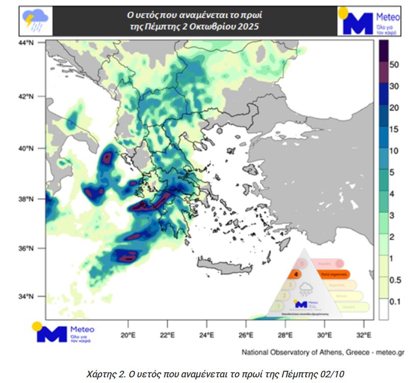 - Σύμφωνα με την κατηγοριοποίηση των επεισοδίων βροχόπτωσης (Regional Precipitation Index), η οποία εφαρμόζεται από τη μονάδα Meteo του Εθνικού Αστεροσκοπείου Αθηνών, το επεισόδιο βροχόπτωσης για την Πέμπτη 02/10 κατατάσσεται στην Κατηγορία 4 (Πολύ Σημαντική).
