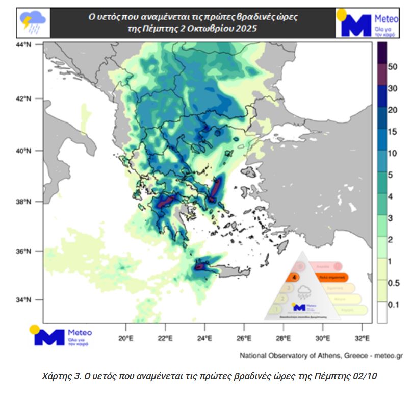 Σημειώνεται ότι σύμφωνα με Έκτακτο Δελτίο Επικίνδυνων Καιρικών Φαινομένων (ΕΔΕΚΦ) που εκδόθηκε σήμερα από την Εθνική Μετεωρολογική Υπηρεσία (ΕΜΥ), κακοκαιρία με ισχυρές βροχές, καταιγίδες και τοπικές χαλαζοπτώσεις προβλέπονται στη χώρα μας το διήμερο Πέμπτης (2-10-25) – Παρασκευής (3-10-25).