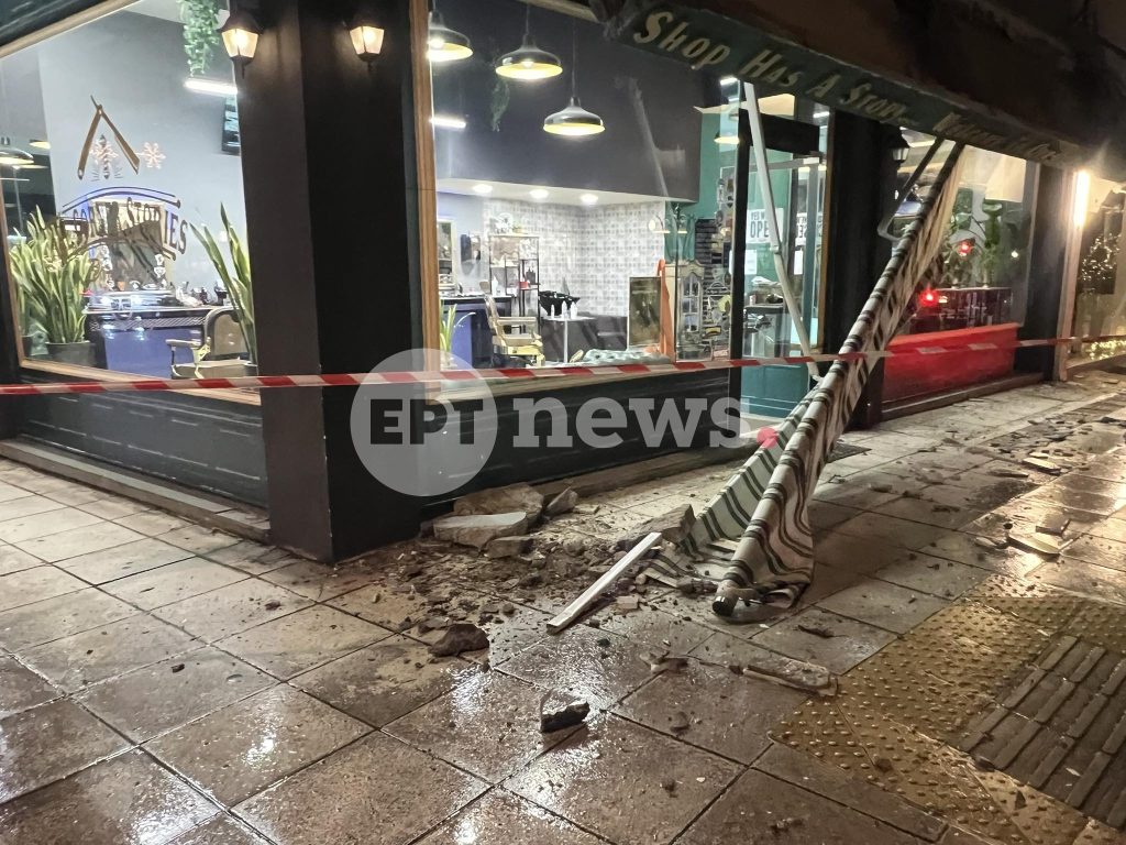 Μεγάλα κομμάτια τσιμέντου κατέληξαν στο πεζοδρόμιο, ενώ σύμφωνα με πληροφορίες της ΕΡΤ λίγο έλειψε να πέσει και μονάδα κλιματιστικού.