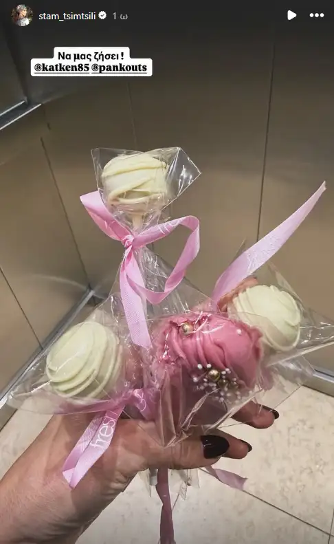 «Να μας ζήσει Κατερίνα και Παναγιώτη», έγραψε η Σταματίνα Τσιμτσιλή, ανεβάζοντας κάποια κεράσματα που κρατούσε στο χέρι της.