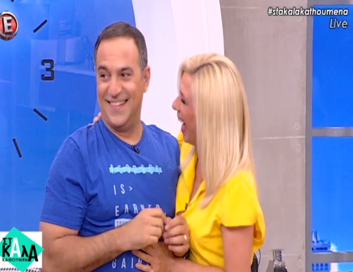 Λίγο αργότερα, την ώρα που έκατσαν στο τραπέζι στην καθιερωμένη θέση τους για να συζητήσουν τη lifestyle επικαιρότητα της εβδομάδας, ο Κρατερός είπε στην Κατερίνα με το δικό του χιούμορ ανέφερε: «Να πούμε ότι τόσο καιρό φορούσαν μαύρα όλοι και πρώτη φορά φόρεσαν ένα χρώμα γιατί επέστρεψε το χρώμα…» και η παρουσιάστρια απάντησε στο ίδιο ύφος: «Παιδιά παραλίγο να μην επιστρέψω…».