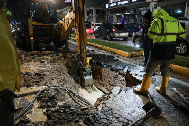 Σύμφωνα με την ΕΡΤ, η διακοπή έγινε λόγω θραύσης αγωγού και καθίζησης του οδοστρώματος στο σημείο.