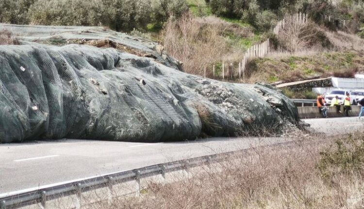 Μεγάλος όγκος χώματος μαζί με φερτά υλικά, μπάζα και πέτρες υποχώρησε από το βουνό, τα προστατευτικά πλέγματα και οι μπάρες δεν άντεξαν, με αποτέλεσμα όλο το χώμα και τα υπόλοιπα υλικά να καταλήξουν στον δρόμο.