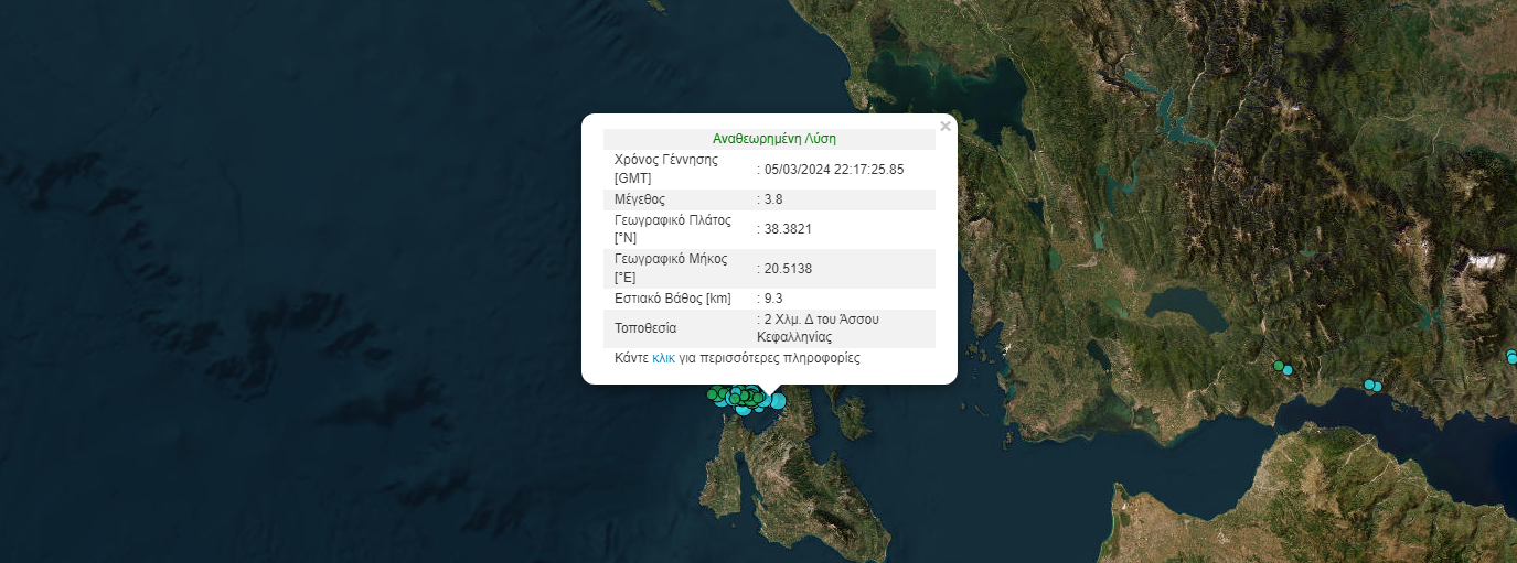 Σύμφωνα με την Αναθεωρημένη Λύση του Γεωδυναμικού Ινστιτούτου Αθηνών μέσα σε διάστημα λίγων λεπτών καταγράφηκαν δύο σεισμοί εντάσεως 3,6 και 3,8 βαθμών της κλίμακας Ρίχτερ στην περιοχή Άσσου Κεφαλληνίας.
