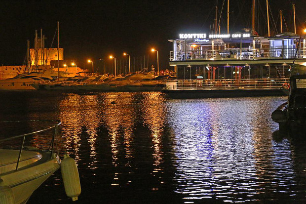 Το Kontiki floating restaurant θα μπορούσε να χαρακτηριστεί ένα ιστορικό αξιοθέατο στο μικρό λιμάνι της Ρόδου. Βρίσκεται στο ίδιο σημείο, κάτω από τους μύλους, από το 1960 και με θέα όλα τα ιστορικά κτίρια της πόλης αλλά και το παλάτι του Μεγάλου Μαγίστρου, αποτελεί ένα μοναδικό στολίδι για την πόλη της Ρόδου και ένα σύγχρονο meeting point για καφέ, φαγητό και ποτό από το πρωί έως αργά το βράδυ.