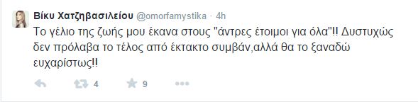 Η Βίκυ Χατζηβασιλείου σχολίασε μέσω twitter τον λόγο που αποχώρησε από την θεατρική παράσταση “Άνδρες Έτοιμοι για όλα” δίνοντας έτσι την απάντησή της στην ηθοποιό Ευαγγελία Μουμούρη.