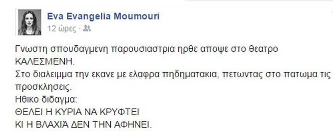 “Γνωστή σπουδαγμένη παρουσιάστρια ήρθε απόψε στο θέατρο καλεσμένη. Στο διάλειμμα την έκανε με ελαφρά πηδηματάκια, πετώντας στο πάτωμα τις προσκλήσεις. Ηθικό δίδαγμα: Θέλει η κυρία να κρυφτεί κι η βλαχιά δεν την αφήνει”, έγραψε η ηθοποιός Ευαγγελία Μουμούρη στο facebook χωρίς να διευκρινίσει για ποια μιλάει.