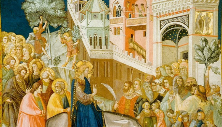 Ερχόμενος ο Ιησούς από τη Βηθανία στα Ιεροσόλυμα, έστειλε δύο από τους Μαθητές του και του έφεραν ένα γαϊδουράκι. Και κάθισε πάνω του για να μπει στην πόλη. Ο δε λαός, ακούγοντας ότι ο Ιησούς έρχεται, πήραν αμέσως στα χέρια τους βάγια από φοίνικες και βγήκαν να τον υποδεχτούν. Και άλλοι μεν με τα ρούχα τους, άλλοι δε κόβοντας κλαδιά από τα δέντρα, έστρωναν το δρόμο απ’ όπου ο Ιησούς θα περνούσε.