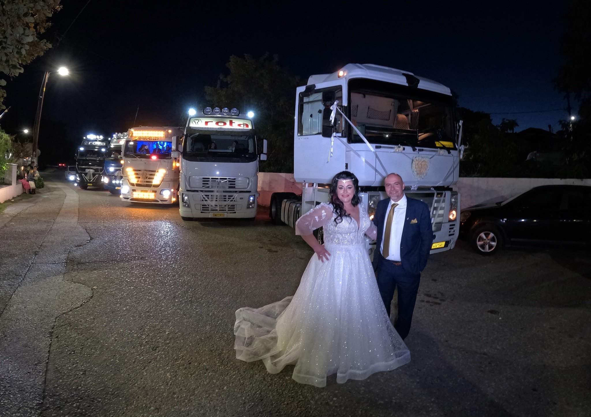 Οι συνάδελφοι του γαμπρού τα είχαν κανονίσει όλα άψογα, στολίζοντας τα φορτηγά τους για να συνοδεύσουν το ζευγάρι. Την πιο ευτυχισμένη ημέρα της ζωής τους οι τράκτορες έδωσαν έναν ευχάριστο τόνο, με τις κόρνες στη διαπασών.