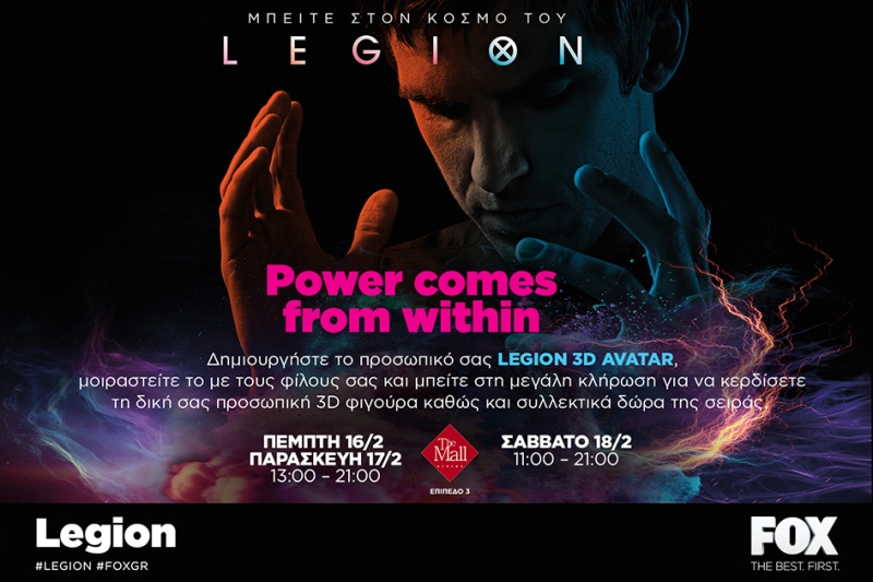 Την Πέμπτη 16/2, Παρασκευή 17/2 (13:00 έως 21:00) και το Σάββατο 18/2 (11:00 έως 21:00), φαντασία και πραγματικότητα γίνονται ένα, στο The Mall Athens (επίπεδο 3)! Το FOX δίνει την ευκαιρία σε όλους να μπουν στο συναρπαστικό σύμπαν του «LEGION», της νέας σειράς που προβάλλεται κάθε Πέμπτη στις 22:40, στο FOX και on demand μέσω FOX Play.