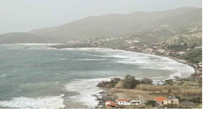 Η εικόνα από τον Εβγάτη αποτυπώνει τη σφοδρότητα των ανέμων που πλήττουν τη Λήμνο. Η θάλασσα είναι φουρτουνιασμένη, με τα κύματα να «σπάνε» με ένταση στην ακτογραμμή.