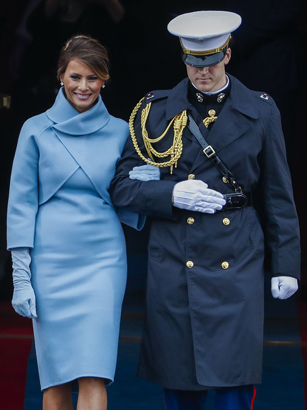 Επιβεβαιώνοντας τις φήμες που είχαν κυκλοφορήσει, η Melania εμφανίστηκε στην τελετή με δημιουργία του Ralph Lauren. Συγκεκριμένα, έβαλε ένα midi φόρεμα, σε baby blue απόχρωση, με oversized γιακά και ladylike κόψιμο.
