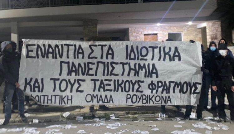 Μέλη της φοιτητικής ομάδας του Ρουβίκωνα πέταξαν τρικάκια και ύψωσαν πανό έξω από το σπίτι του πρύτανη του ΕΜΠ