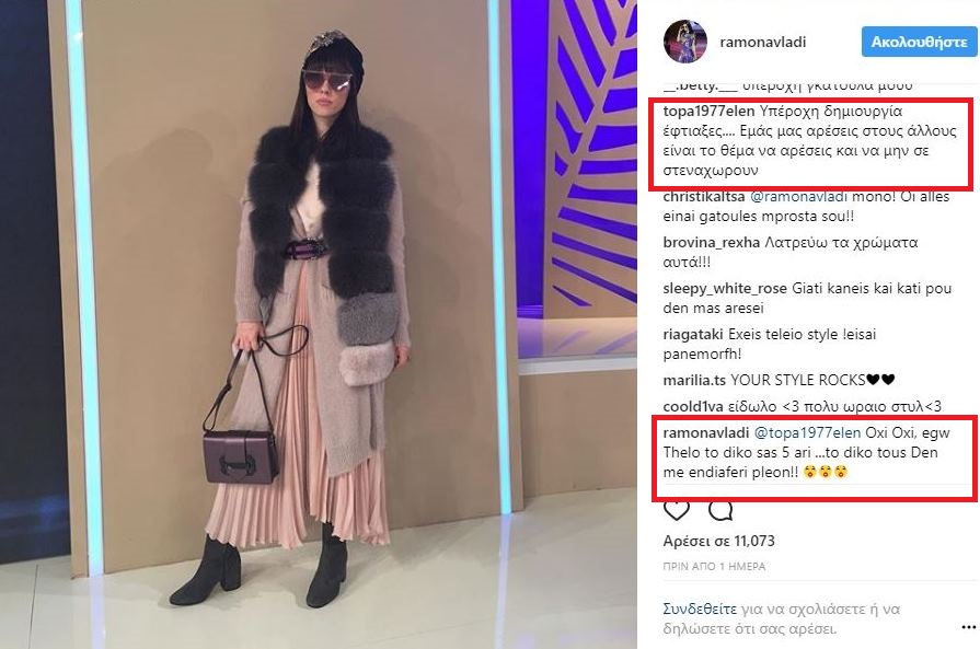 «Εμάς μας αρέσεις στους άλλους είναι το θέμα να αρέσεις και να μην σε στεναχωρούν», σχολίασε follower της Ραμόνας σε μία φωτογραφία με το look της, με την ίδια να απαντά αιχμηρά: «εγώ θέλω το δικό σας 5άρι… Το δικό τους δεν με ενδιαφέρει πλέον!!!».