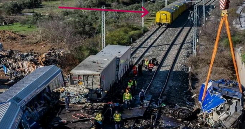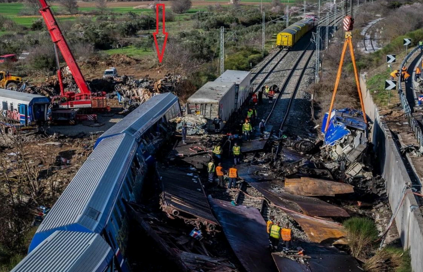 Σε άλλη φωτογραφία, σύμφωνα με τον κ. Κοκοτσάκη, φαίνεται η αμαξοστοιχία μεταφόρτωσης των αντικειμένων και μεταφοράς τους σε άγνωστη κατεύθυνση, «αφού στην θέση Κουλούρι δεν βρέθηκαν. Είναι εμφανής η συνεχόμενη παρουσία της βοηθητικής αμαξοστοιχίας με τα κίτρινα βαγόνια και με φορά που επιτρέπει φόρτωση αυτών των στοιχείων-πειστηρίων».
