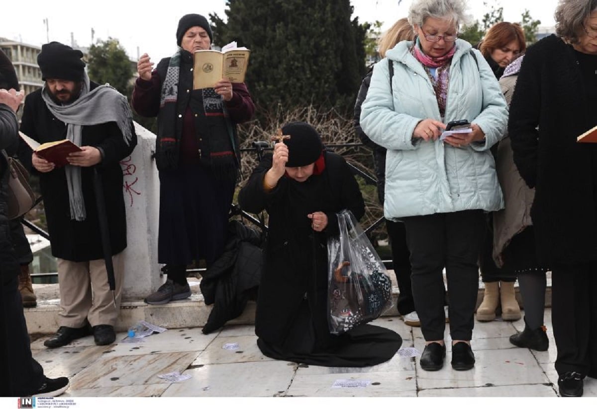 Οι διαμαρτυρόμενοι για το νομοσχέδιο έψελναν και φώναζαν συνθήματα, κρατώντας στα χέρια τους εικόνες και σταυρούς.