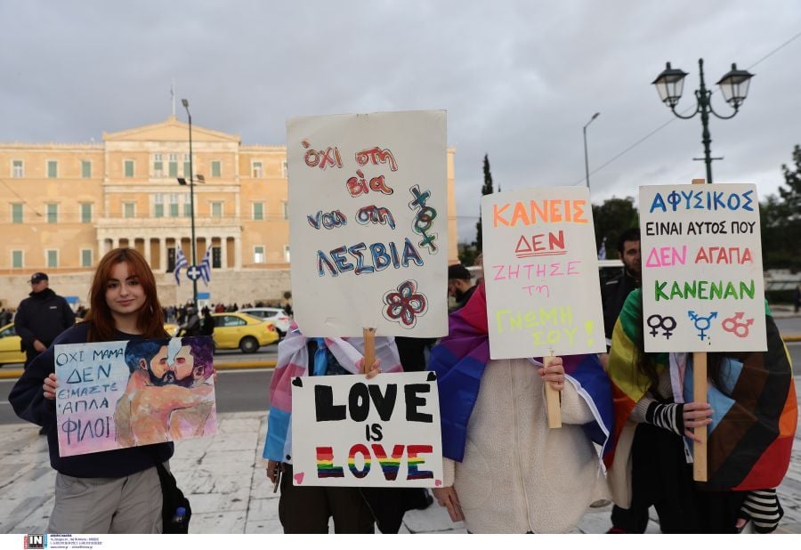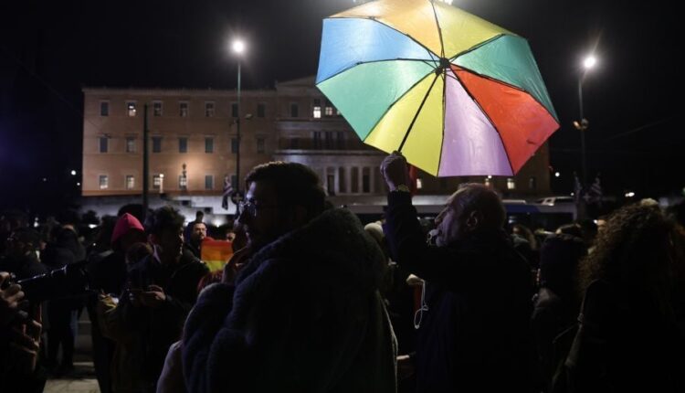 Νομοσχέδιο για τα ομόφυλα ζευγάρια: Με πολύχρωμες σημαίες μέλη της ΛΟΑΤΚΙ+ κοινότητας έξω από την Βουλή – ΦΩΤΟ