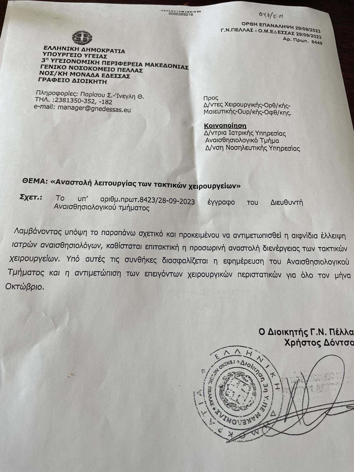 Επιπρόσθετα, αναφερόμενος στα νοσοκομεία της Θεσσαλονίκης ο πρόεδρος της ΠΟΕΔΗΝ επισημαίνει τα εξής: «Στα νοσοκομεία της Θεσσαλονίκης στις 70 ανεπτυγμένες χειρουργικές αίθουσες λειτουργούν οι 43. Το Παπανικολάου δεν είναι το μόνο νοσοκομείο που ανέστειλε τα τακτικά χειρουργεία. Το ίδιο έπραξε και το νοσοκομείο ΕΔΕΣΣΑΣ για το μήνα ΟΚΤΩΜΒΡΗ καθότι έμειναν μόνο 2 αναισθησιολόγοι από 4».