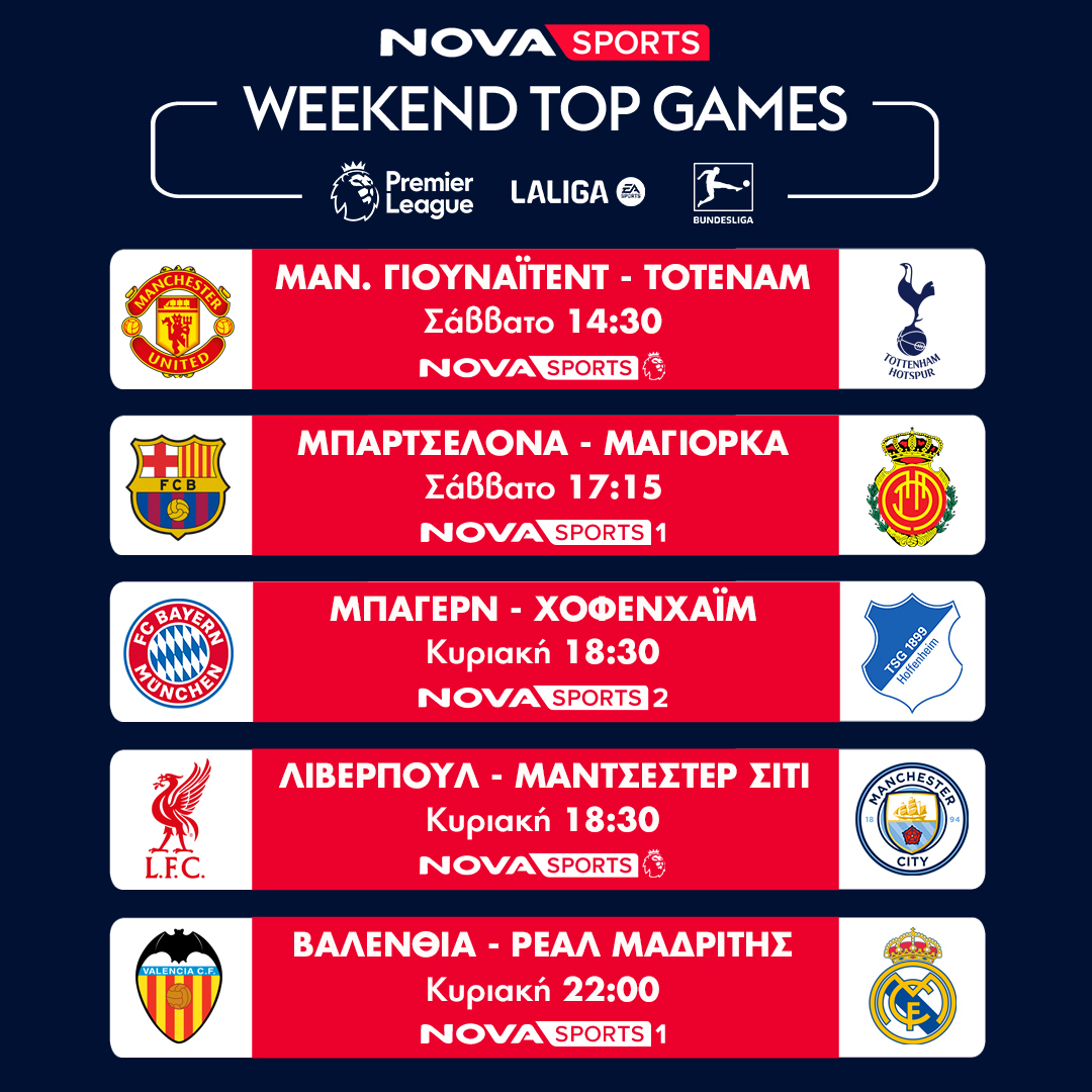 Μεγάλα ντέρμπι και ποδοσφαιρική πανδαισία από τα γήπεδα της Ελλάδας και της Ευρώπης, περιμένει τους συνδρομητές της Nova και αυτή την εβδομάδα μέσα από το ασυναγώνιστο μπουκέτο αθλητικού περιεχομένου που περιλαμβάνει όλα τα αθλητικά γεγονότα των καναλιών Novasports και Cosmote Sport, όλα στην πλατφόρμα EON!