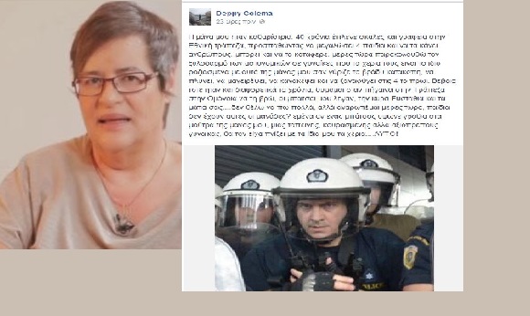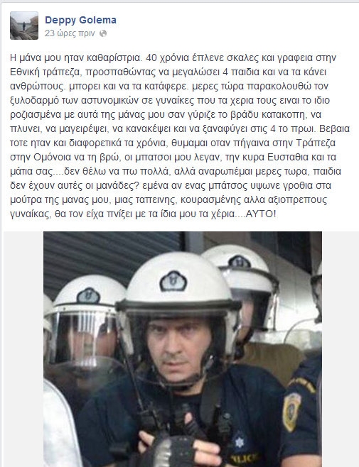 «Η μάνα μου ήταν καθαρίστρια. 40 χρόνια έπλενε σκάλες και γραφεία στην Εθνική τράπεζα, προσπαθώντας να μεγαλώσει 4 παιδιά και να τα κάνει ανθρώπους. Μπορεί και να τα κατάφερε. Μέρες τώρα παρακολουθώ τον ξυλοδαρμό των αστυνομικών σε γυναίκες που τα χέρια τους είναι το ίδιο ροζιασμένα με αυτά της μάνας μου σαν γύριζε το βράδυ κατάκοπη, να πλύνει, να μαγειρέψει, να κανακέψει και να ξαναφύγει στις 4 το πρωί. Βέβαια τότε ήταν και διαφορετικά τα χρόνια, θυμάμαι όταν πήγαινα στην Τράπεζα στην Ομόνοια να τη βρω, οι μπάτσοι μου λέγαν, την κυρά Ευσταθία και τα μάτια σας….δεν θέλω να πω πολλά, αλλά αναρωτιέμαι μέρες τώρα, παιδιά δεν έχουν αυτές οι μανάδες? εμένα αν ένας μπάτσος ύψωνε γροθιά στα μούτρα της μάνας μου, μιας ταπεινής, κουρασμένης αλλά αξιοπρεπούς γυναίκας, θα τον είχα πνίξει με τα ίδια μου τα χέρια….ΑΥΤΟ!».