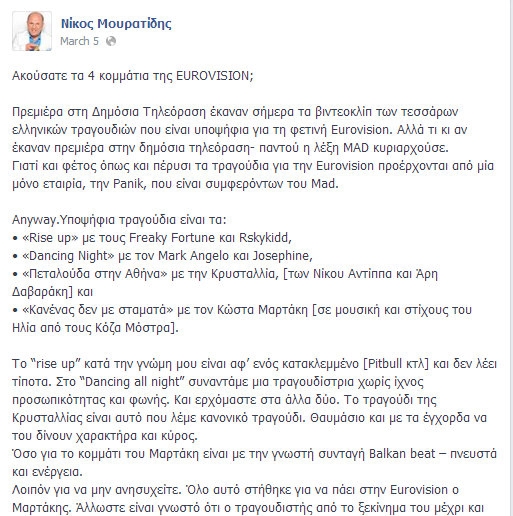 «Να ακυρωθεί η φωτεινή μας υποψηφιότητα για την Eurovision 2014. Τώρα! Δεν είναι δυνατόν ο διαγωνισμός τραγουδιού της Eurovision να διοργανώνεται από ένα ιδιωτικό μουσικό κανάλι και από μία ΜΟΝΟ εταιρία δίσκων. Δεκάδες νέοι δημιουργοί έμειναν απ’ έξω γιατί δεν ανήκουν στην Panik records. Να ακυρωθεί τώρα» γράφει φανερά εκνευρισμένος και ενοχλημένος.