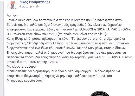 Ξανάβαλα να ακούσω τα τραγούδια της Panik records που θα πάνε φέτος στην Eurovision. Μα καλά, αυτός ο διαγωνισμός τραγουδιού δεν είναι των δημοσίων τηλεοράσεων κάθε χώρας; Εδώ γιατί παντού λέει EUROSONG 2014 «A MAD SHOW». Η Eurovision είναι show του MAD; (το οποίο MAD είναι της Panik!!!). Και η Ελληνική δημόσια τηλεόραση τι κάνει; Το ξέρουν αυτό από το εξωτερικό οι διοργανωτές; Ότι δηλαδή στην Ελλάδα (ή αλλιώς μπανανία) το φεστιβάλ Eurovision διοργανώνεται από ένα ιδιωτικό μουσικό κανάλι και από ΜΙΑ μόνο, εταιρία δίσκων; Επίσης είναι πάρα πολλοί οι δημιουργοί που διαμαρτύρονται που δεν μπόρεσαν να στείλουν τα τραγούδια τους στην δημόσια τηλεόραση, γιατί λέει η EUROVISION έγινε μονοπώλιο του MAD και της PANIK. Μα είμαστε σοβαροί; Μήπως πρέπει να διαμαρτυρηθούν όλοι οι νέοι δημιουργοί – Μήπως πρέπει να ακυρωθεί ο διαγωνισμός; Μήπως να μην πάμε καθόλου στην Eurovision; Μήπως μας κοροϊδεύουν»;
