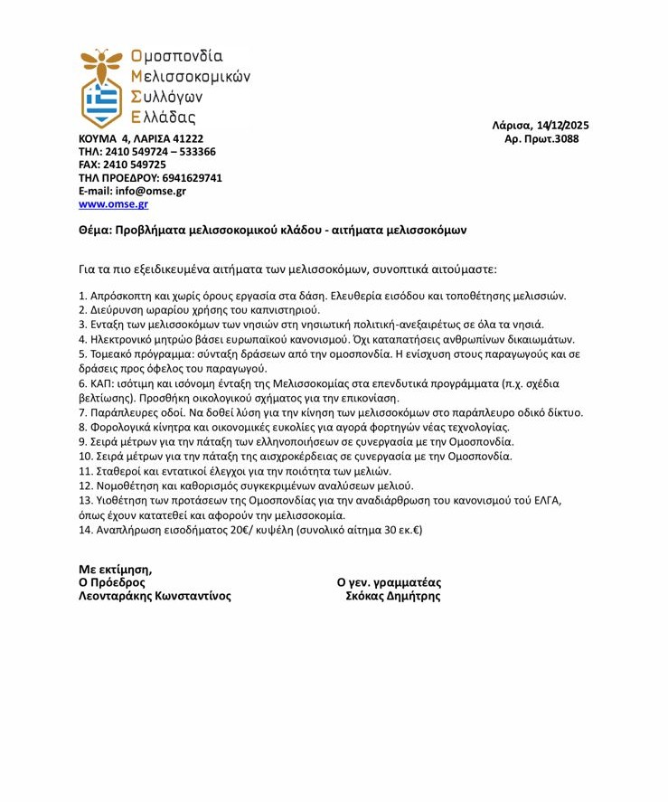 Τέλος, στα αιτήματα των μελισσοκόμων περιλαμβάνεται μεταξύ άλλων η αναπλήρωση του εισοδήματος τους με 20 ευρώ ανά κυψέλη αλλά και η ισότιμη και ισόνομη ένταξη της Μελισσοκομίας στα επενδυτικά προγράμματα της ΚΑΠ.