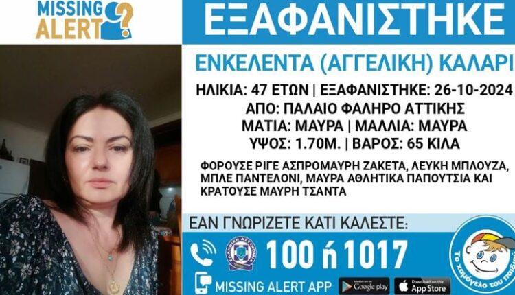 Συναγερμός σήμανε στις Αρχές για την εξαφάνιση της 47χρονης Ενκελέντα (Αγγελικής) Καλάρι από το Παλαιό Φάληρο.