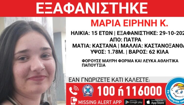 Την εξαφάνιση της Μαρίας Ειρήνης, Κ. 15 ετών στην Πάτρα, γνωστοποίησε το «Χαμόγελο του Παιδιού» με ανακοίνωσή του τις πρώτες πρωινές ώρες του Σαββάτου (01.11.2025).