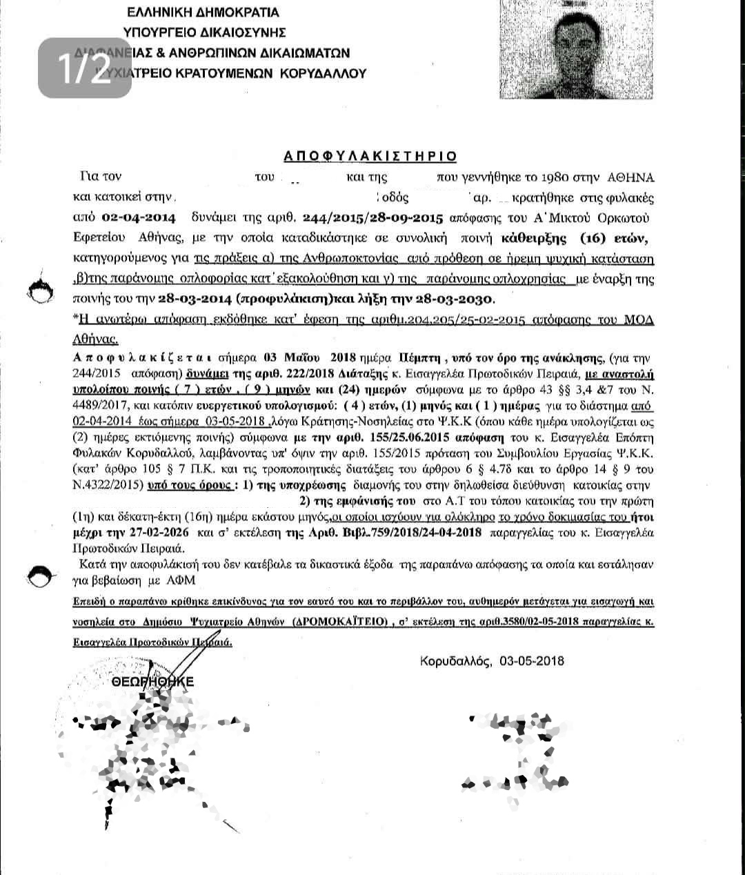 Σύμφωνα με το αποφυλακιστήριο, ο 46χρονος είχε αποφυλακιστεί από το Ψυχιατρείο Κρατουμένων Κορυδαλλού στις 3 Μαΐου του 2018, κάνοντας χρήση των διατάξεων του λεγόμενου νόμου Παρασκευόπουλου και της τελευταίας τροποποίησής του, που προέβλεπε τη δυνατότητα αποφυλάκισης κρατουμένων, οι οποίοι είχαν εκτίσει το ήμισυ της ποινής τους με ευεργετικό υπολογισμό.