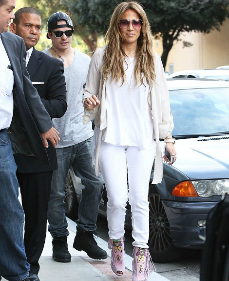 Η Τζένιφερ Λόπεζ επέλεξε να φορέσει ένα λευκό παντελόνι με μια λευκή πουκαμίσα. Ως εκεί καλά. Το πρόβλημα ήταν στα… πόδια της, αφού η Λατίνα σταρ έκανε μια εντελώς αψυχολόγητη επιλογή. Φόρεσε ένα ζευγάρι λιλά peep-toe μποτίνια, κεντημένο με χάντρες και κρόσσια. Το αποτέλεσμα ήταν εντελώς άκομψο, αλλά και πέρα για πέρα κιτς.
