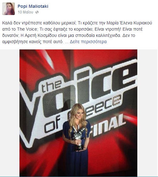 Επίθεση μέσω του προσωπικού λογαριασμού της στο facebook έκανε η Πόπη Μαλλιωτάκη σε όλους όσους σχολιάζουν αρνητικά την νικήτρια του The Voice, Μαρία Έλενα Κυριακού επειδή δεν κατάφερε να νικήσει η Αρετή Κοσμίδου.