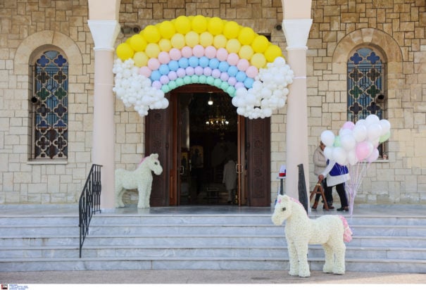 Μπαλόνια με μηνύματα για την Ραφαέλα και ένα μεγάλο ουράνιο τόξο στόλιζαν το ναό. Συγκινημένοι οι φίλοι της τόνισαν ότι «μπόρα ήταν και πέρασε».