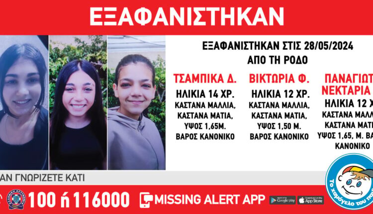 Η Τσαμπίκα Δ. 14 ετών, η Παναγιώτα-Νεκταρία Κ. 12 ετών και η Βικτωρία Φ. 12 ετών εξαφανίστηκαν στις 28/05/24, και ώρα 16:00. Το Χαμόγελο του Παιδιού ενημερώθηκε σήμερα 29/05/24 και κατόπιν εισαγγελικής εντολής προχώρησε στη δημοσιοποίηση των στοιχείων των τριών κοριτσιών.