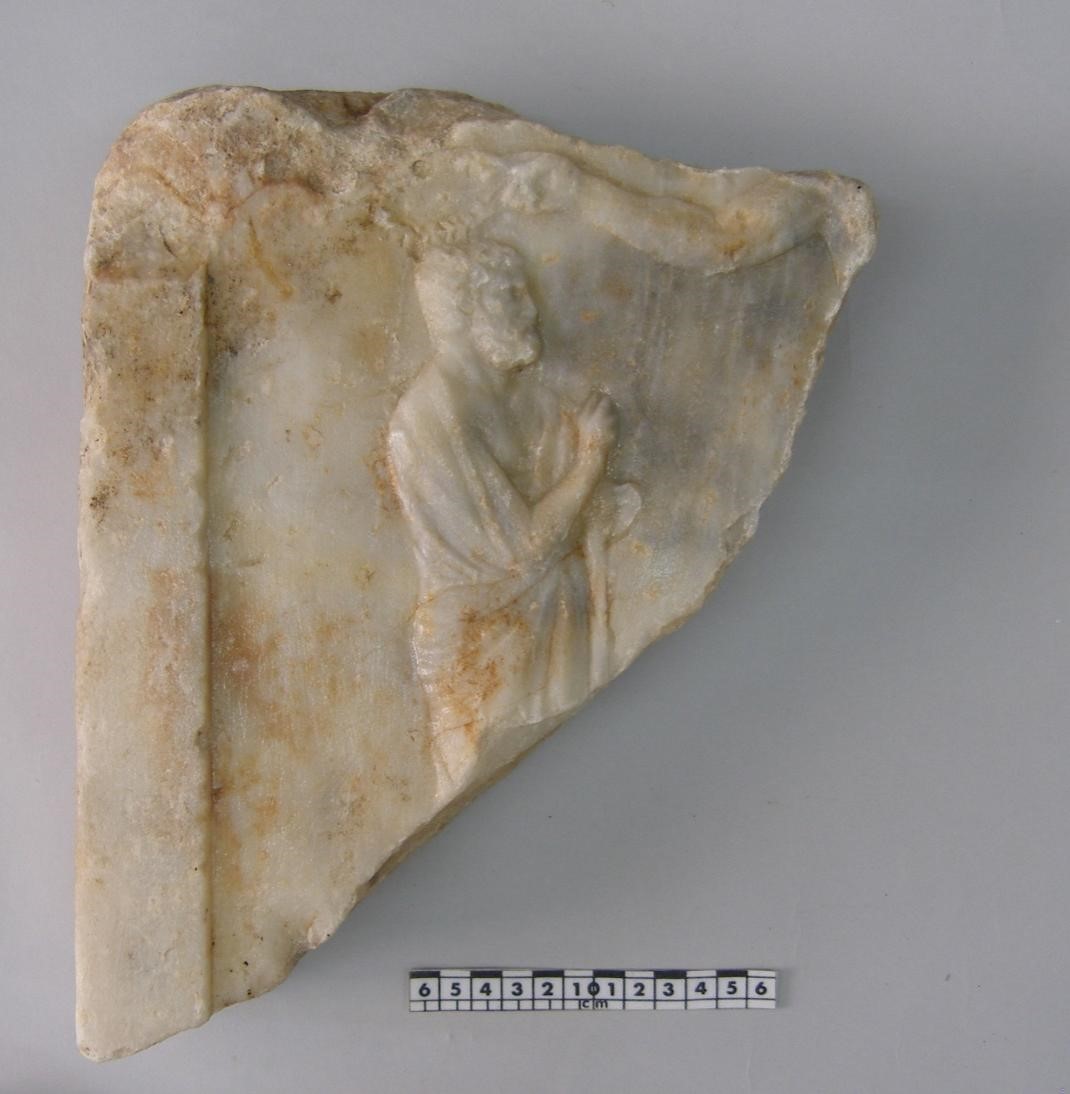Από τα μαρμάρινα ευρήματα, δύο είναι ιδιαίτερης σημασίας και χρονολογούνται στον 4ο αι. πΧ: Το πρώτο είναι ένα θραύσμα στήλης με τμήμα επιγραφής (ψηφίσματος), σε 2-3 αποσπασματικούς στίχους, και το δεύτερο το ανώτερο μέρος (επίτιτλο) άλλης στήλης, που σίγουρα θα έφερε τιμητικό ψήφισμα, με τμήμα ανάγλυφης παράστασης, από την οποία διατηρείται το γυμνό μυώδες δεξιό χέρι μεγαλόσωμης μορφής, πιθανώς ήρωος (του Αίαντος;) να στεφανώνει όρθιο γενειοφόρο άνδρα. Η σκηνή παραπέμπει ευθέως σε αντίστοιχη ανάγλυφη παράσταση σε μαρμάρινη ψηφισματική στήλη, του 320 πΧ περίπου, στο Αρχαιολογικό Μουσείο Σαλαμίνος (ΜΠ 4228), με κύριο πρόσωπο τον ήρωα, στο περιβάλλον της περίφημης εφηβικής εορτής των Αιαντείων.