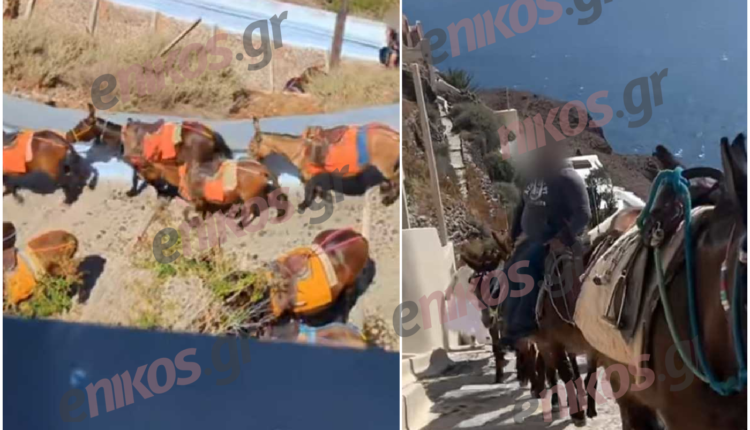 Στον – για πολλούς – επίγειο κυκλαδίτικο παράδεισο υπάρχουν την ίδια στιγμή δύο τελείως διαφορετικοί κόσμοι. Από την μία τα εμβληματικά λευκά νησιώτικα σπίτια, με το πολυφωτογραφημένο μαγευτικό ηλιοβασίλεμα και τις εντυπωσιακές παραλίες που έχουν διαφορετικά χρώματα άμμου και καταγάλανα νερά, κι από την άλλη τα «ιπποειδή εργασίας» ανεβοκατεβαίνουν με τουρίστες στην πλάτη τους, σχεδόν ασταμάτητα σε καθημερινή βάση τα περίπου 600 σκαλοπάτια από το λιμάνι των Φηρών μέχρι και την κορυφή της Καλντέρας, με τους ιδιοκτήτες τους να χρεώνουν την «ονειρική» διαδρομή, η οποία διαρκεί 20-30 λεπτά, 5-6 ευρώ το άτομο.