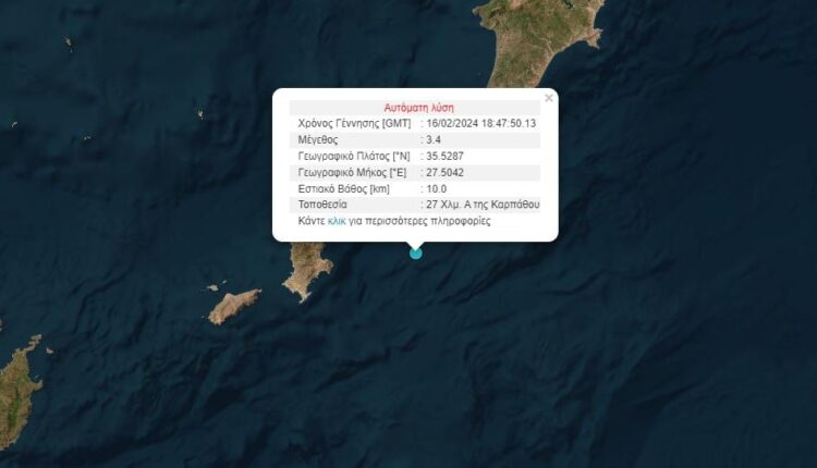 Σεισμός σημειώθηκε στην Κάρπαθο. Ο σεισμός σύμφωνα με την αυτόματη λύση του Γεωδυναμικού Ινστιτούτου, είχε μέγεθος 3,4 Ρίχτερ, με επίκεντρο θαλάσσια περιοχή 27 χιλιόμετρα ανατολικά του νησιού.