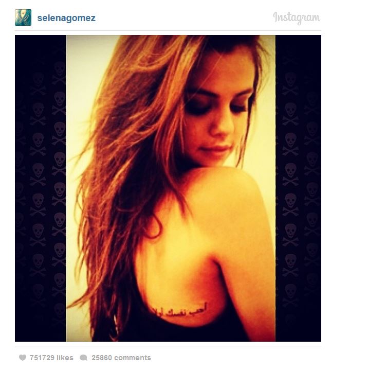 Η Σελένα Γκόμεζ με νέο τατουάζ 17/07/2014 Share Αυτή είναι η φωτογραφία που ανάρτησε! Ενώ όλοι περιμέναμε μία ακόμα selfie ή καλοκαιρινή φωτογραφία της Σελένα Γκόμεζ στο instagram, μας αιφνιδίασε δημοσιεύοντας το νέο της τατουάζ. Πρόκειται για μία φράση στα αραβικά, η οποία σημαίνει «Αγάπησε τον εαυτό σου πρώτα».