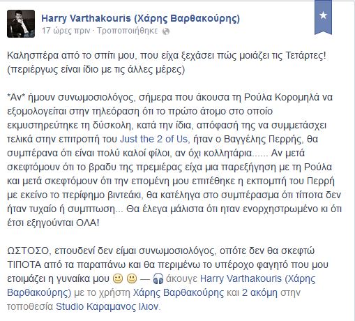 Η ”συνωμοσία” του Χάρη Βαρθακούρη 08/05/2014 Share Και η κόντρα του με τη Ρούλα Κορομηλά Mια εβδομάδα μετά την αποχώρησή του από το ”Just The Two Of Us” ο Χάρης Βαρθακούρης με ένα αναλυτικό μήνυμά του στο facebook αναφέρεται στη Ρούλα Κορομηλά.
