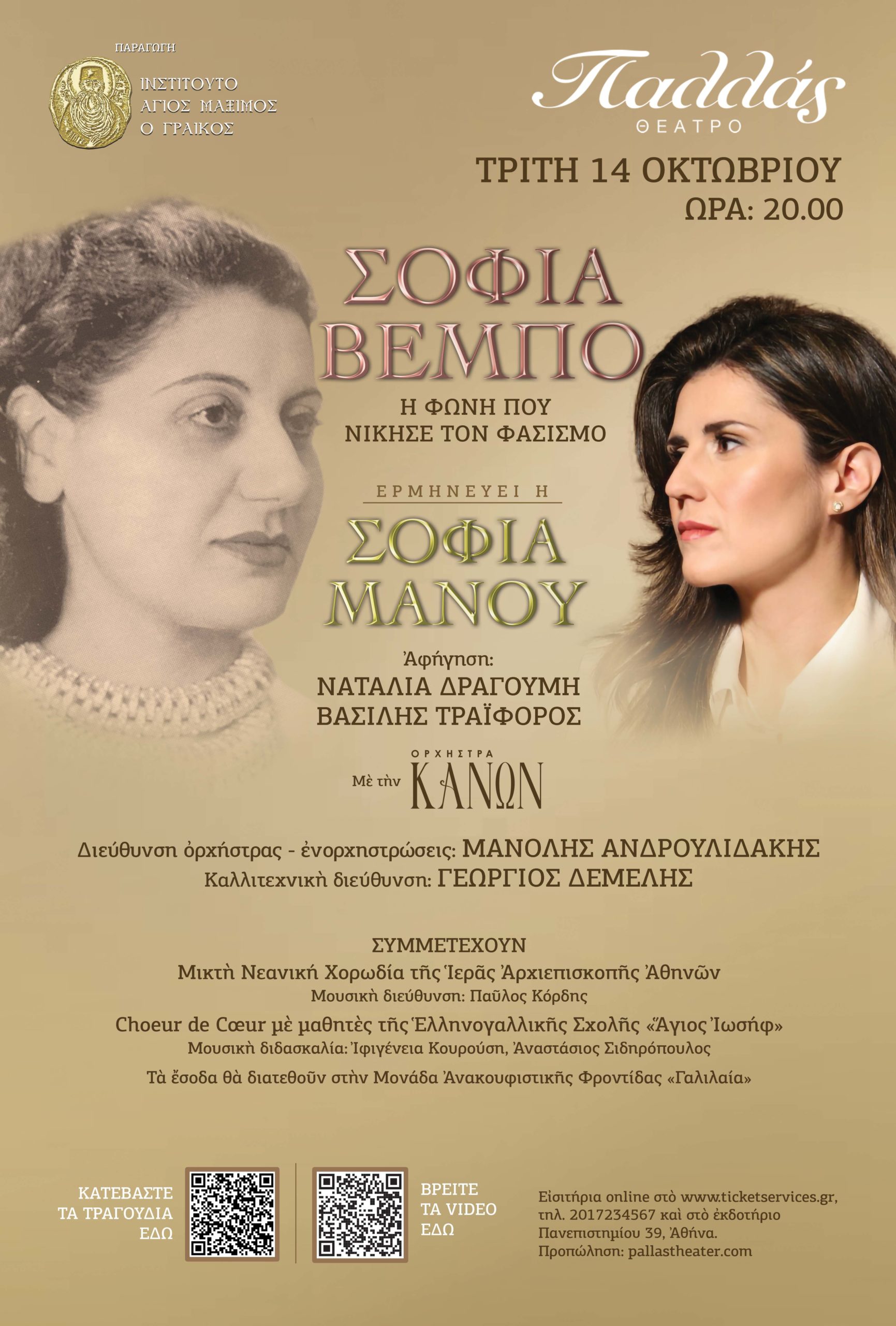 Η Σοφία Μάνου με αφορμή τη μεγάλη συναυλία-αφιέρωμα «Σοφία Βέμπο – Η φωνή που νίκησε τον φασισμό», στις 14 Οκτωβρίου στις 20:00 στο Θέατρο Παλλάς μιλά αποκλειστικά στο enikos.gr, για τη «Φωνή της Νίκης», για τον ρόλο της τέχνης σήμερα, αλλά και για την έμπνευση πίσω από αυτό το μεγάλο έργο που φέρει τη σφραγίδα του Γέροντα Εφραίμ του Βατοπαιδινού και του Ινστιτούτου «Άγιος Μάξιμος ο Γραικός».