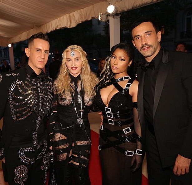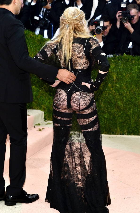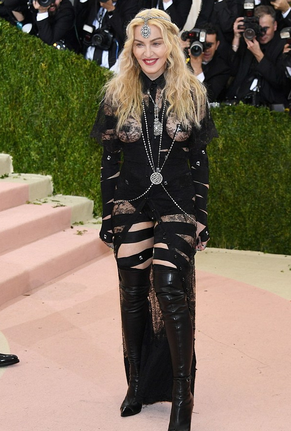 Ένα μαύρο κοστούμι με bondage στοιχεία τόσο προκλητικό που άφηνε έκθετο το στήθος της και τα οπίσθιά της ήταν αυτό που προτίμησε η Μαντόνα για να εμφανιστεί σε ένα από τα πολυαναμενόμενα event κάθε χρονιάς. Για να συμπληρώσει την εικόνα της μάλιστα η τραγουδίστρια επέλεξε και ένα ζευγάρι μαύρες ψηλές μπότες που τις συνδύασε με μία σειρά από δερμάτινα λουριά που ανέβαιναν μέχρι τους μηρούς της.