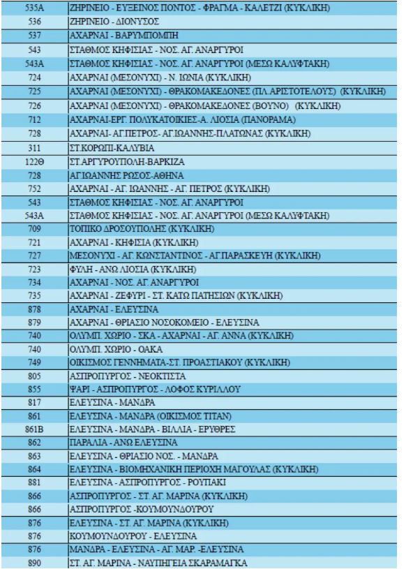 Στις Λεωφορειακές γραμμές που αναφέρονται στον παρακάτω πίνακα, όλα τα δρομολόγια θα πραγματοποιηθούν κανονικά.