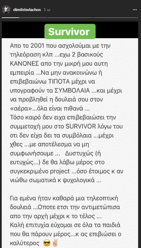 Δυστυχώς ή ευτυχώς δεν θα λάβω μέρος στο συγκεκριμένο project, όσο έτοιμος κι αν νιώθω σωματικά και ψυχολογικά. Για μένα ήταν καθαρά μια τηλεοπτική δουλειά. Οπότε έτσι την αντιμετώπισα από την αρχή μέχρι το τέλος. Καλή επιτυχία εύχομαι σε όλα τα παιδιά που θα πάρουν μέρος και ας επιβιώσει ο καλύτερος», έγραψε ο Δημήτρης Βλάχος.
