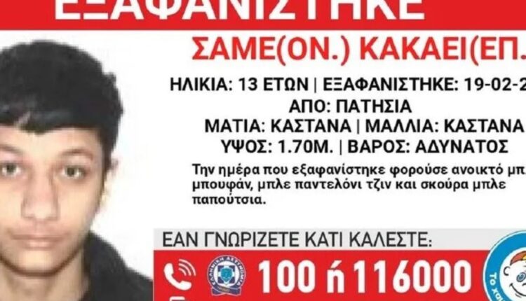 Ένα 13χρονο αγόρι εξαφανίστηκε στην Αθήνα με αποτέλεσμα να υπάρχει κινητοποίηση στις αρχές. Πρόκειται για τον Κάκαει Σάμε, ιρανικής καταγωγής, τα ίχνη του οποίου χάθηκαν το πρωί της Πέμπτης από τα Πατήσια.