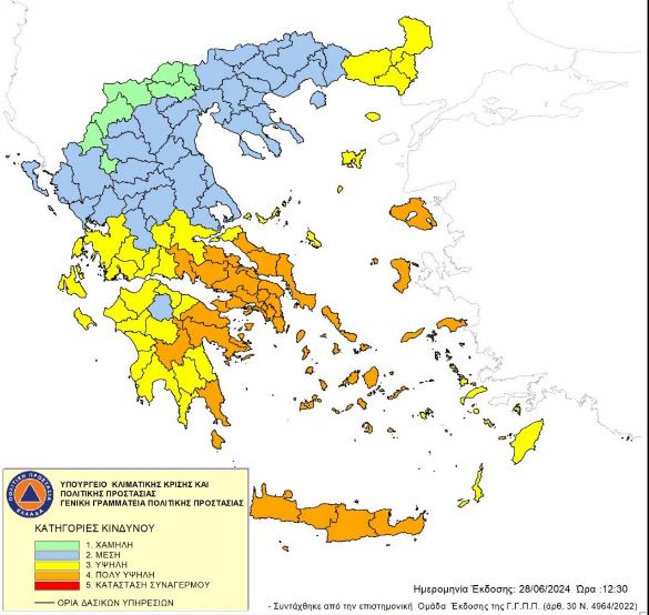 Σύμφωνα με τον Χάρτη Πρόβλεψης Κινδύνου Πυρκαγιάς που εκδίδει η Γενική Γραμματεία Πολιτικής Προστασίας του Υπουργείου Κλιματικής Κρίσης & Πολιτικής Προστασίας (civilprotection.gov.gr), για αύριο Σάββατο 29 Ιουνίου 2024, προβλέπεται πολύ υψηλός κίνδυνος πυρκαγιάς (κατηγορία κινδύνου 4) για τις εξής περιοχές: