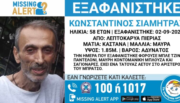 Ο 58χρονος Κωνσταντίνος Σιαμήτρας εξαφανίστηκε το μεσημέρι της Δευτέρας 2 Σεπτεμβρίου από την περιοχή της Λεπτοκαρυάς Πιερίας, σύμφωνα με ανακοίνωση του Οργανισμού «Το Χαμόγελο του Παιδιού».