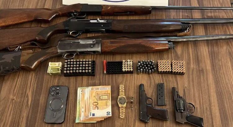 Σε σωματική έρευνα, καθώς και σε έρευνα που πραγματοποιήθηκε στην οικία του, βρέθηκαν και κατασχέθηκαν και όπλα χωρίς σχετική άδεια και συγκεκριμένα, τρεις κυνηγετικές καραμπίνες, περίστροφο, πιστόλι, 251 φυσίγγια, 500 ευρώ, ρολόι και κινητό τηλέφωνο. Ο συλληφθείς οδηγήθηκε στην αρμόδια εισαγγελική Αρχή.