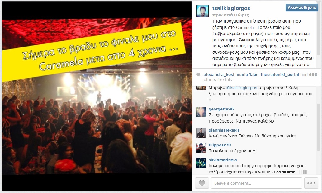 «Ήταν πραγματικα απίστευτη βραδιά αυτή που ζήσαμε στο Caramela. Το τελευταίο μου Σαββατόβραδο στο μαγαζί που τόσο αγάπησα και με αγάπησε.. Άκουσα λόγια αυτές τις μέρες από τους ανθρώπους της επιχείρησης, τους συναδέλφους μου και φυσικά τον κόσμο μας , που αισθάνομαι ηθικά τόσο πλήρης και καλυμμένος που σήμερα το βράδυ στο μεγάλο φινάλε για μένα στο Caramela δε χρειάζονται πολλά λόγια».