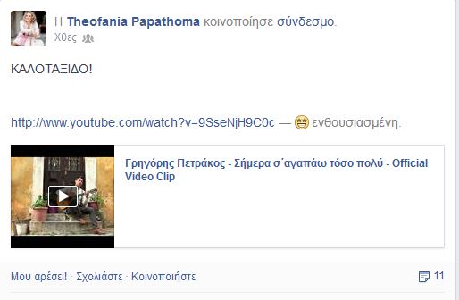 Η Θεοφανία Παπαθωμά ανήρτησε στο προφίλ της στο facebook το νέο βίντεο κλιπ του Γρηγόρη Πετράκου με τίτλο «Σήμερα σ’ αγαπώ τόσο πολύ».