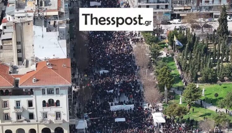 Θεσσαλονίκη: Εικόνες από drone της μεγάλης πορείας για τα 3 χρόνια από την τραγωδία των Τεμπών